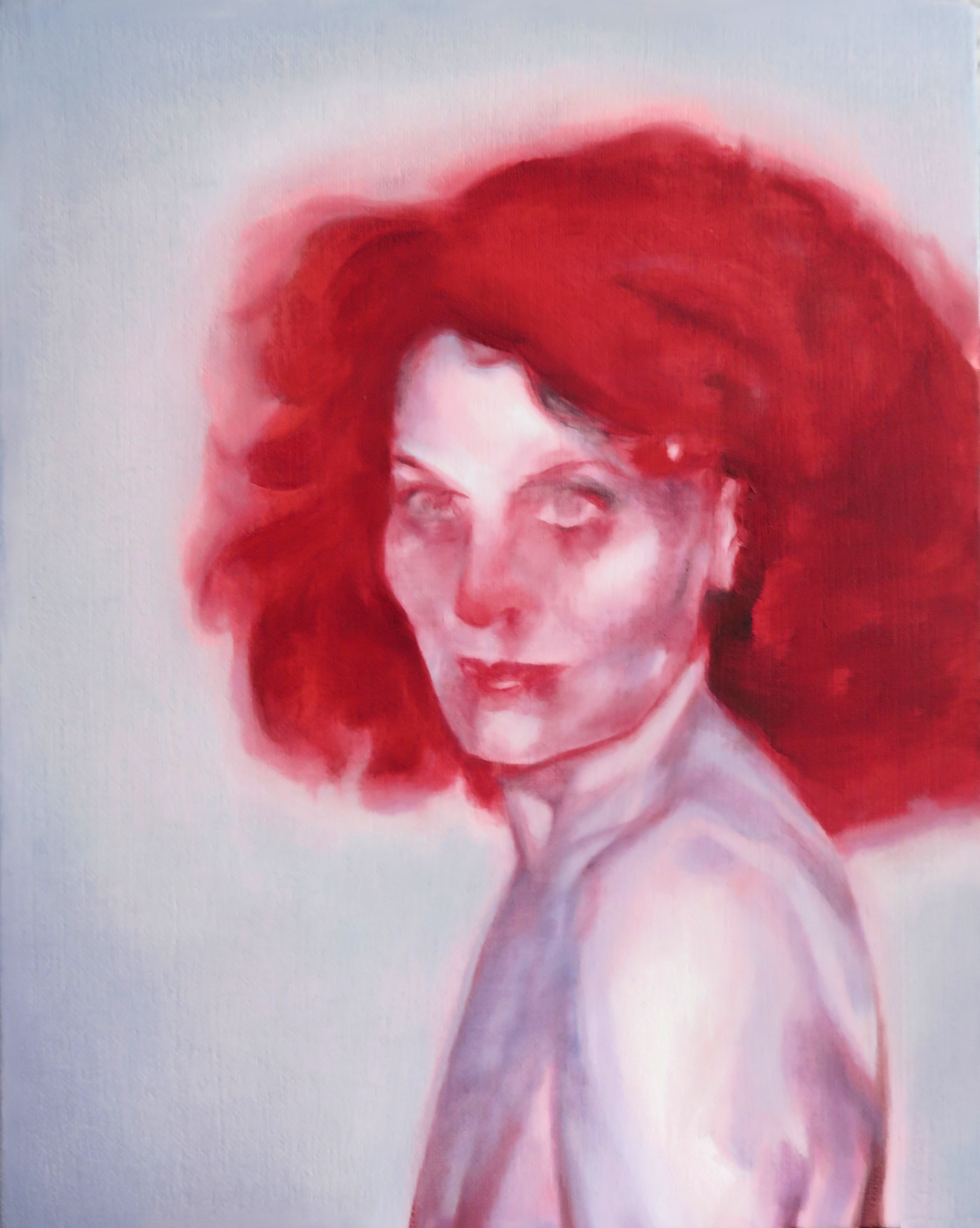 Karen Reyes, por otro lado, deja en claro la relación anecdótica que tiene con su material con el que entabla una discusión abierta e intuitiva, permitiendo que el trayecto entre lo que se quiere y lo que se encuentra pueda revelar su simbología. Esto me parece importante más cuando la intención de la pintora es romper los lazos propios para con la idea de la belleza. Desde un inicio sabemos que la intención de Quiebre de afección, y en particular de la serie de Artificio inestable de añadidos y sustituciones es la de una ruptura de una idolatría. Desde un inicio estamos advertidos: la pintora toma como cliché pictórico la idea de la belleza femenina. ¿Qué existe en una mujer más allá de lo que proyecta? ¿Porqué despierta admiración la belleza? ¿Qué implica la belleza para una mujer? Algo muy claro es que estamos ante una serie de representaciones de iconos del cine y del arte y que la pintura es el medio a través del cual opera el quiebre de la afección que sentíamos por ellas, afección transmitida por las imágenes fotográficas que otorgan inmortalidad. Pero también, desde un inicio estamos ante varias ambivalencias. Por un lado, no son 8 mujeres retratadas sino 7 mujeres y un travesti, el último siendo uno de los artistas pop más célebre del siglo XX. 4 de las mujeres son actrices o encarnan personajes en el retrato, 2 son anónimas. Por otro lado, es preciso decir que afección tiene un doble significado, puede significar dolencia al mismo tiempo que admiración. De esta doble ambivalencia que trabaja por capas tal y como opera el proceso pictórico deducimos que la ambivalencia es central como posibilidad pictórica y por ende interpretativa en el trabajo de Karen Reyes. De estas primeras observaciones se puede decir que, para la artista, el trayecto de trayecto de lo que acontece entre la intención, el modelo y la pintura es definitorio de lo que aparece en el transcurso de la pintura.